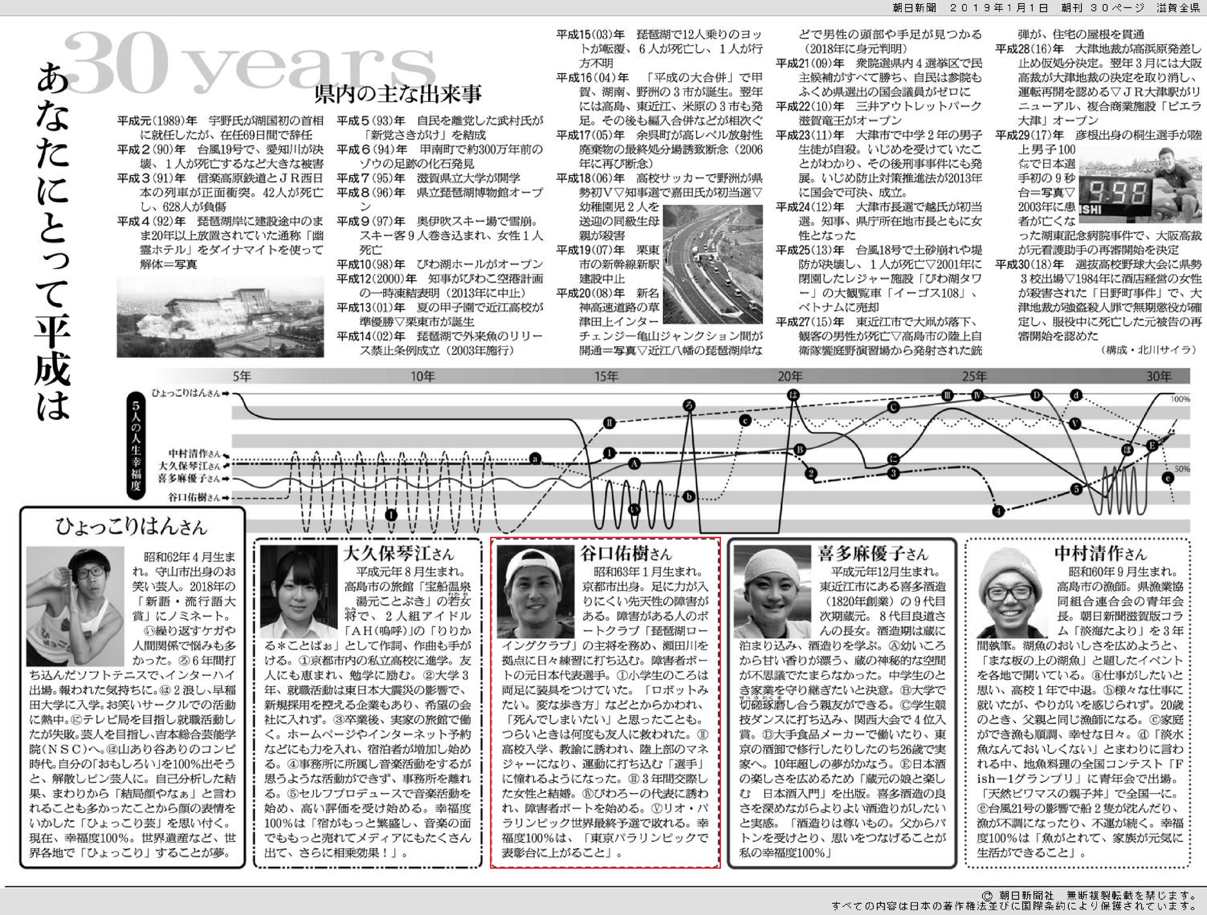 2019/01/01 1月1日紙面(滋賀版)朝日新聞 このたび、「朝日新聞」にて当プロジェクトの取り組みをご紹介いただきました。日頃の活動を丁寧に取り上げていただき、大変励みとなっております。上記より掲載記事をご覧いただけます。