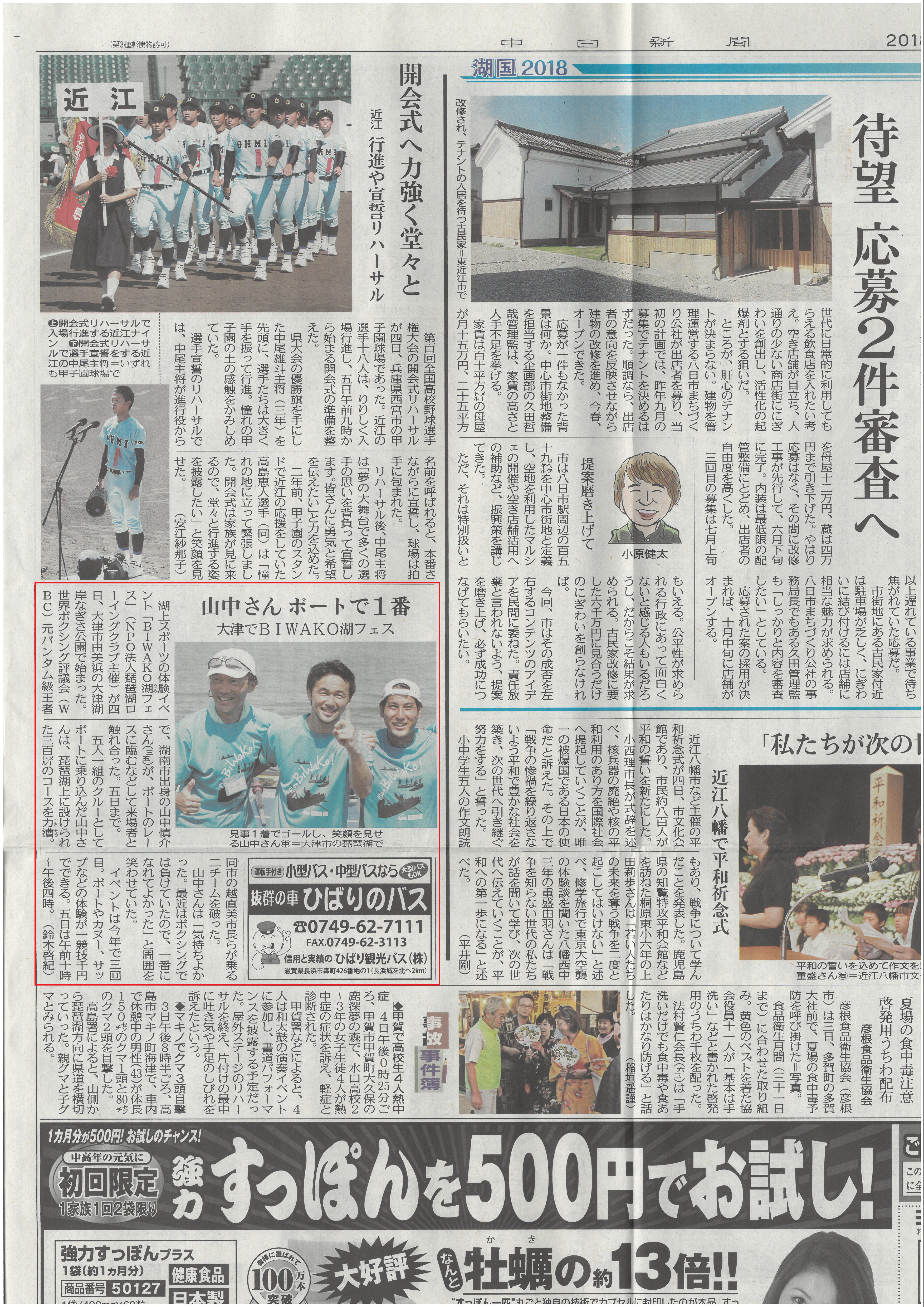 2018/08/05 「中日」湖フェス2018 このたび、「中日新聞」にて当プロジェクトの取り組みをご紹介いただきました。日頃の活動を丁寧に取り上げていただき、大変励みとなっております。上記より掲載記事をご覧いただけます。