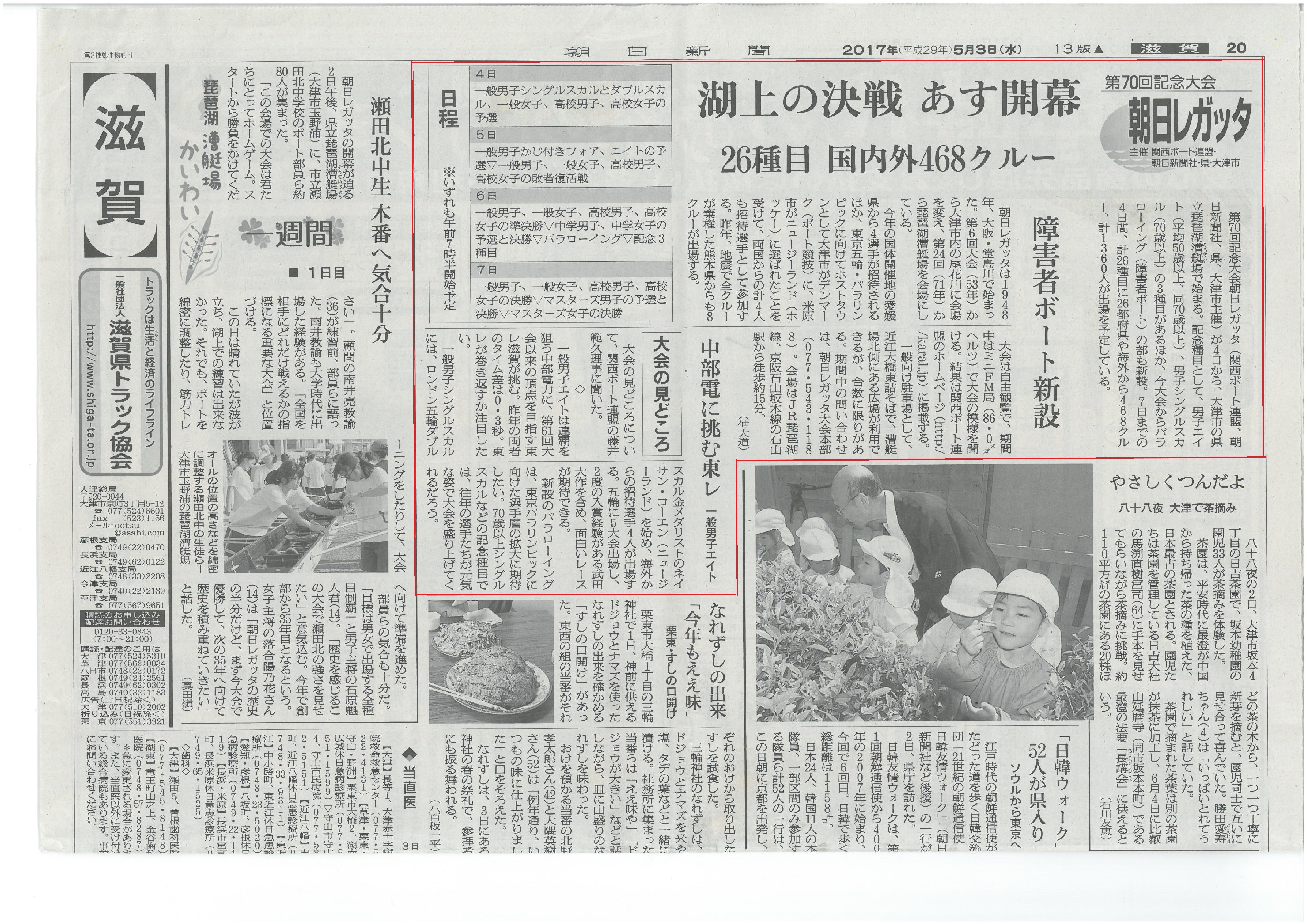 2017/05/03 (朝日レガッタ)朝日新聞 このたび、「朝日新聞」にて当プロジェクトの取り組みをご紹介いただきました。日頃の活動を丁寧に取り上げていただき、大変励みとなっております。上記より掲載記事をご覧いただけます。