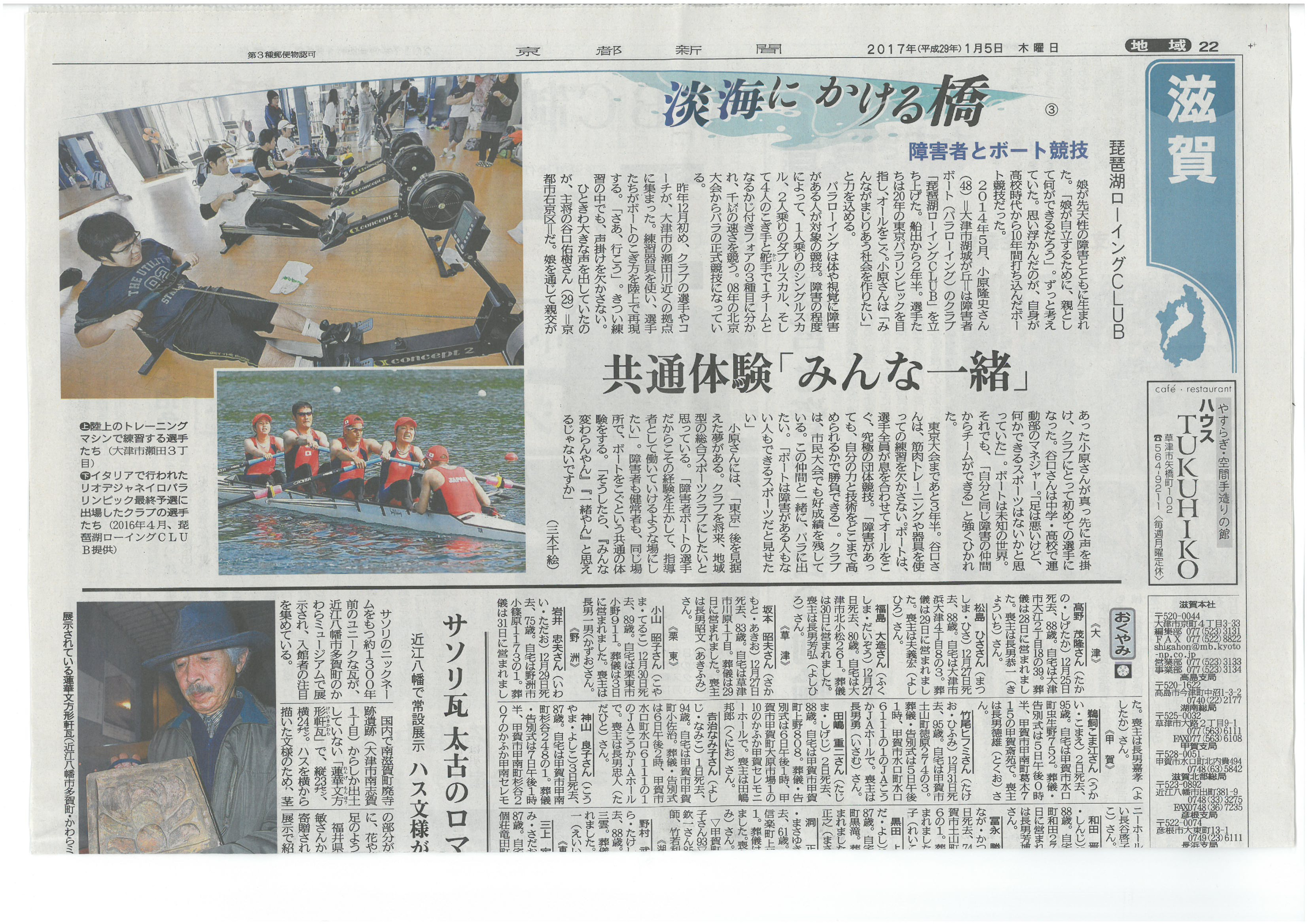 2017/01/05 (淡海にかける橋)朝日新聞 このたび、「朝日新聞」にて当プロジェクトの取り組みをご紹介いただきました。日頃の活動を丁寧に取り上げていただき、大変励みとなっております。上記より掲載記事をご覧いただけます。