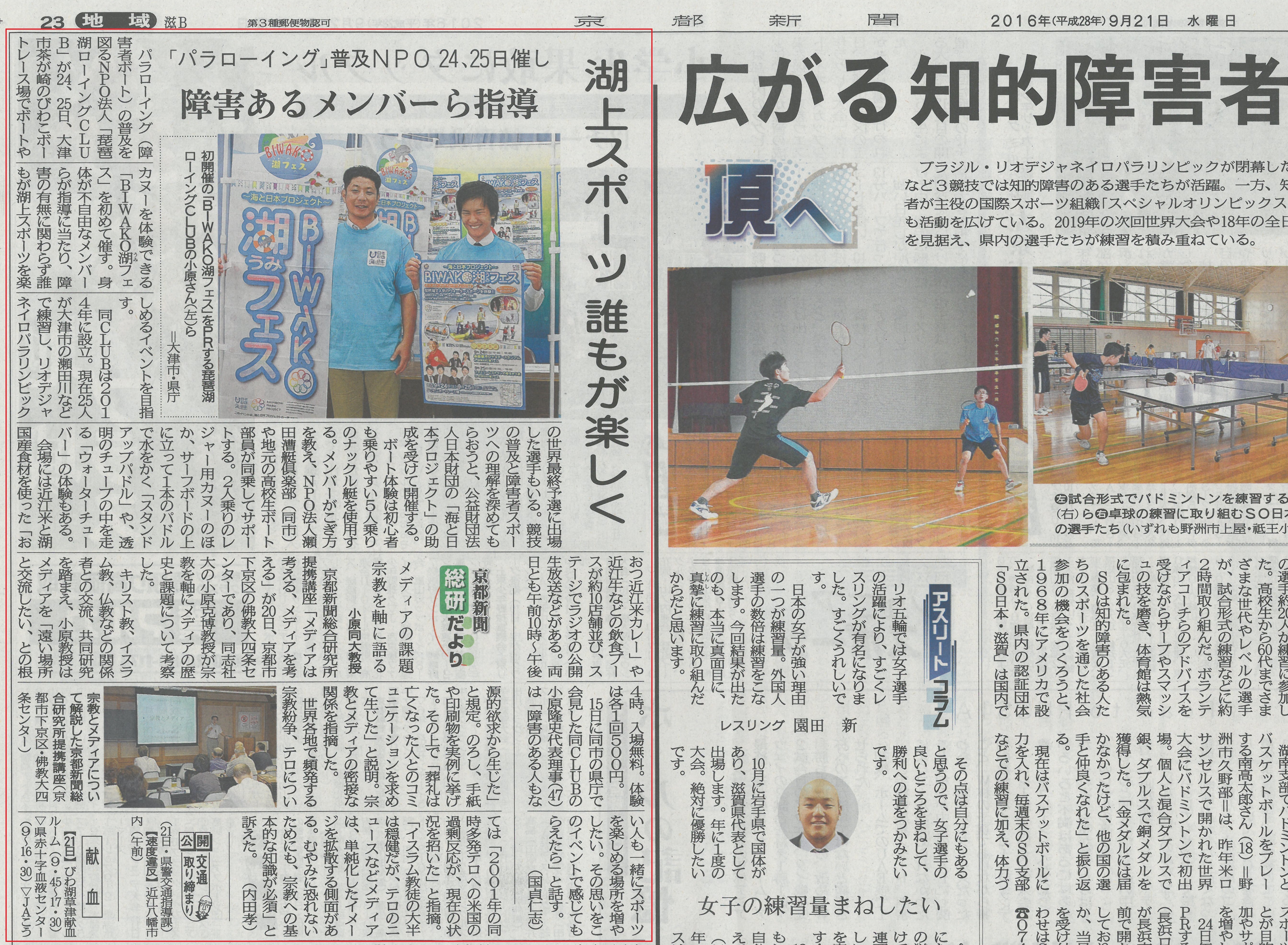 2016/09/21 (記者会見 湖フェス2016)京都新聞 このたび、「京都新聞」にて当プロジェクトの取り組みをご紹介いただきました。日頃の活動を丁寧に取り上げていただき、大変励みとなっております。上記より掲載記事をご覧いただけます。