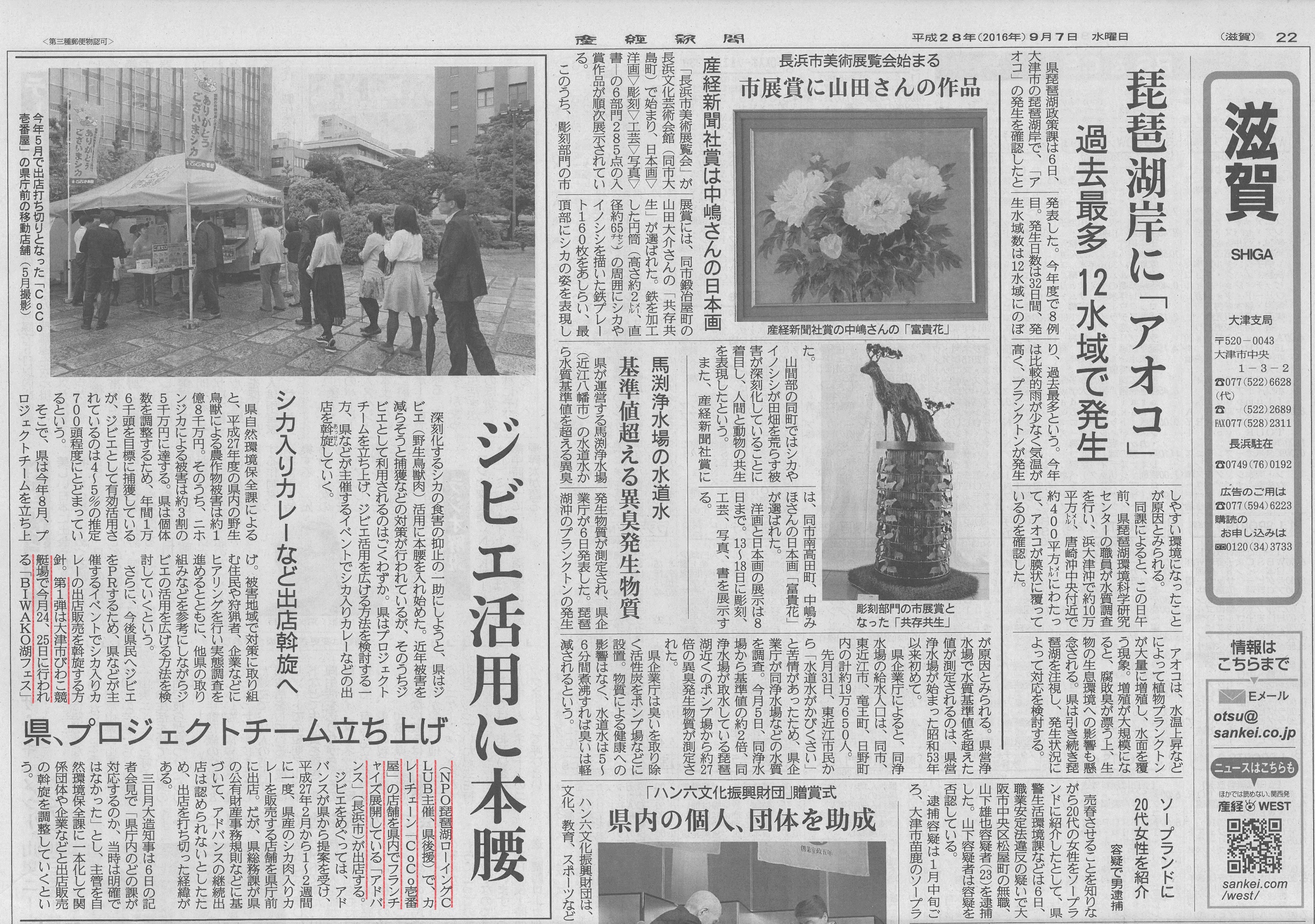2016/09/07 (ジビエ活動 BIWAKO湖フェス)産経新聞 このたび、「産経新聞」にて当プロジェクトの取り組みをご紹介いただきました。日頃の活動を丁寧に取り上げていただき、大変励みとなっております。上記より掲載記事をご覧いただけます。