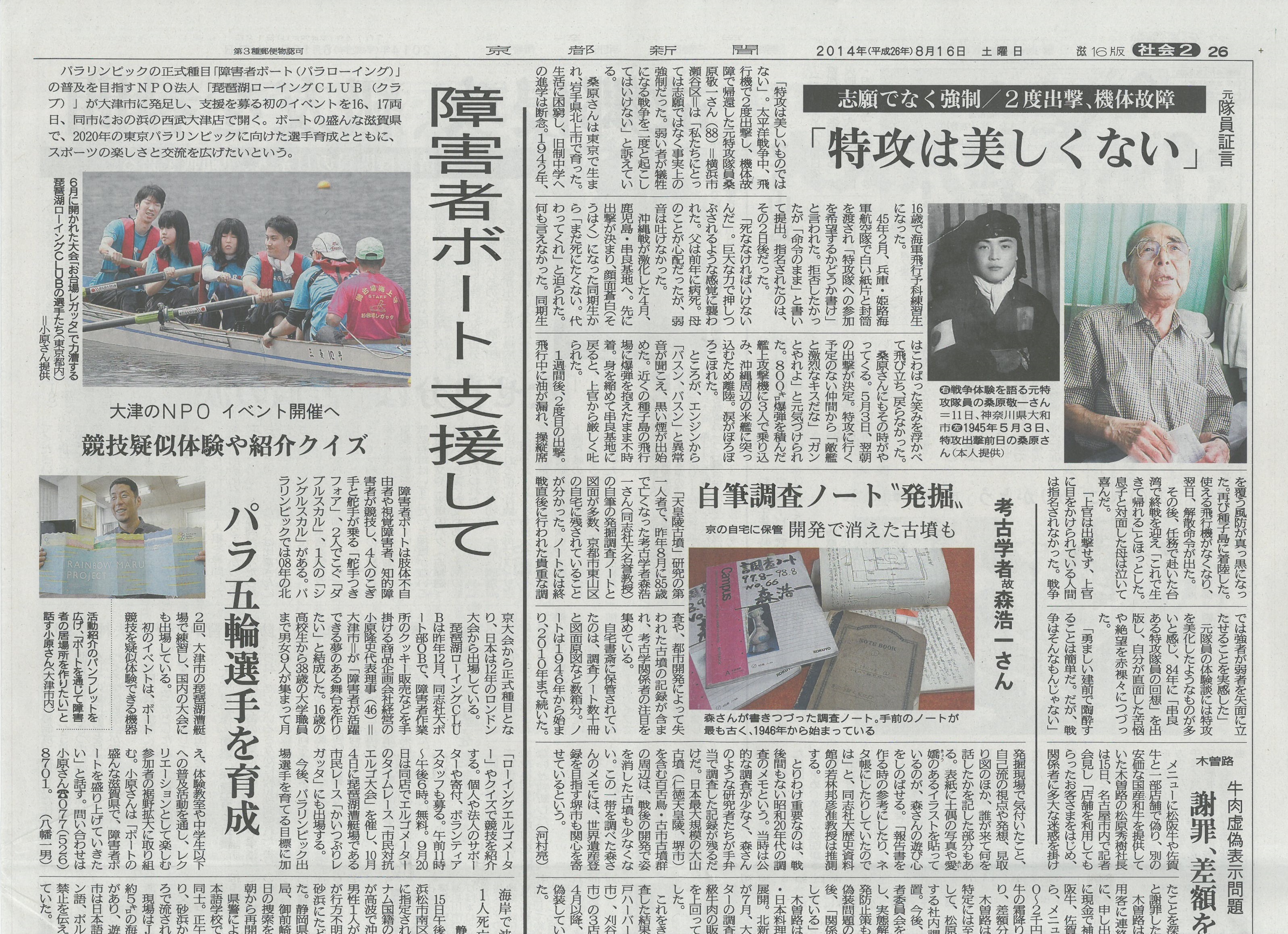 2014/08/16 (障害者ボートを支援して)京都新聞 当プロジェクトの取り組みをご紹介いただきました。日頃の活動を丁寧に取り上げていただき、大変励みとなっております。上記より掲載記事をご覧いただけます。